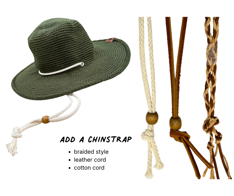 Customize your North Ferry Packable Sun Hat by adding a Chinstrap. Not only does this add extra flair, but it can provide extra security on a windy day or out on the boat. We have 3 cord options to choose from ranging from western to sporty