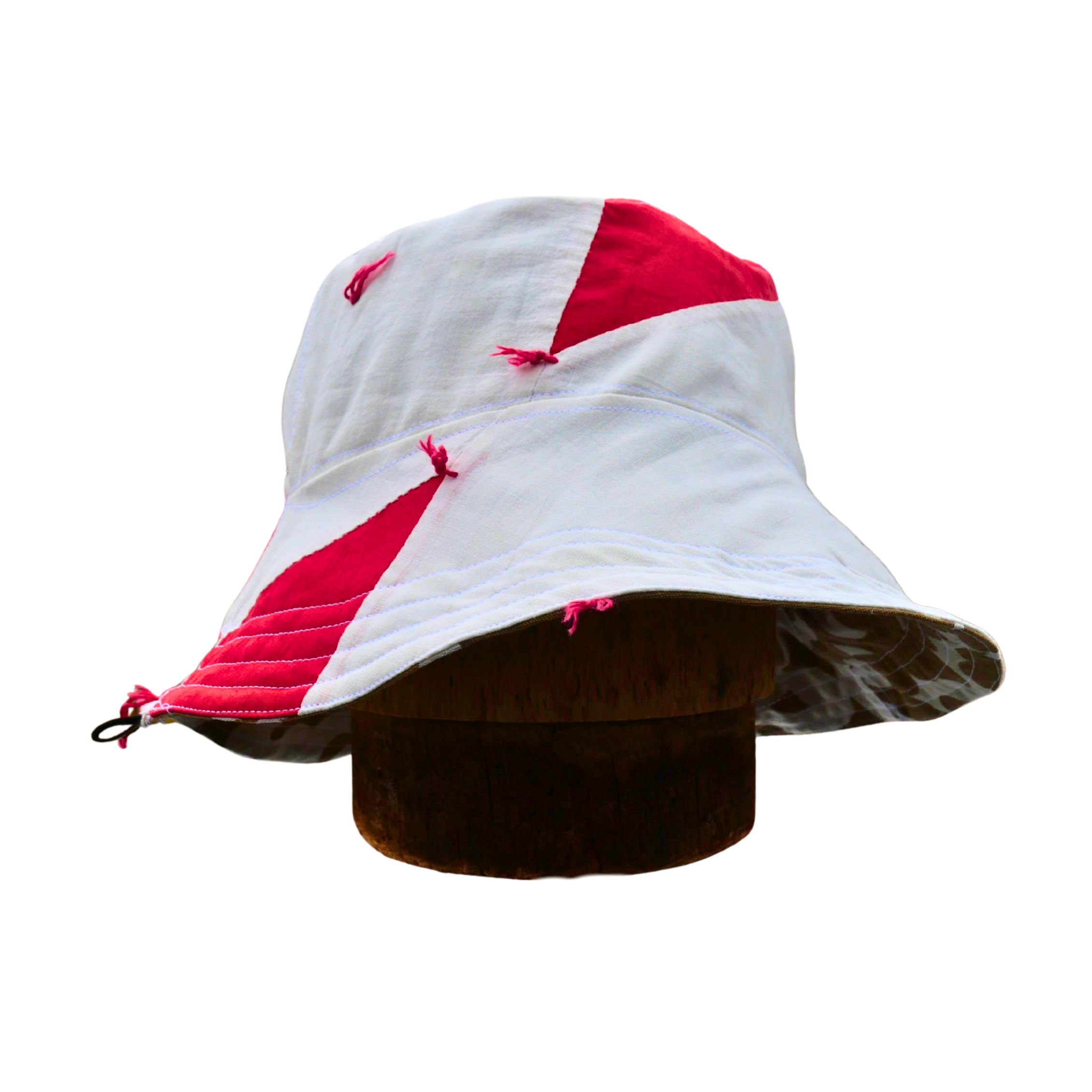North Ferry Hats is offering a small batch of hand-crafted Bucket Hats for Spring 2026. All of our Bucket Hats are made using Upcycled fabrics. Featured hat is a 1 Print Reversible Cotton Canvas Bucket Hat with: White w/ Red Triangles Cotton print on both sides.