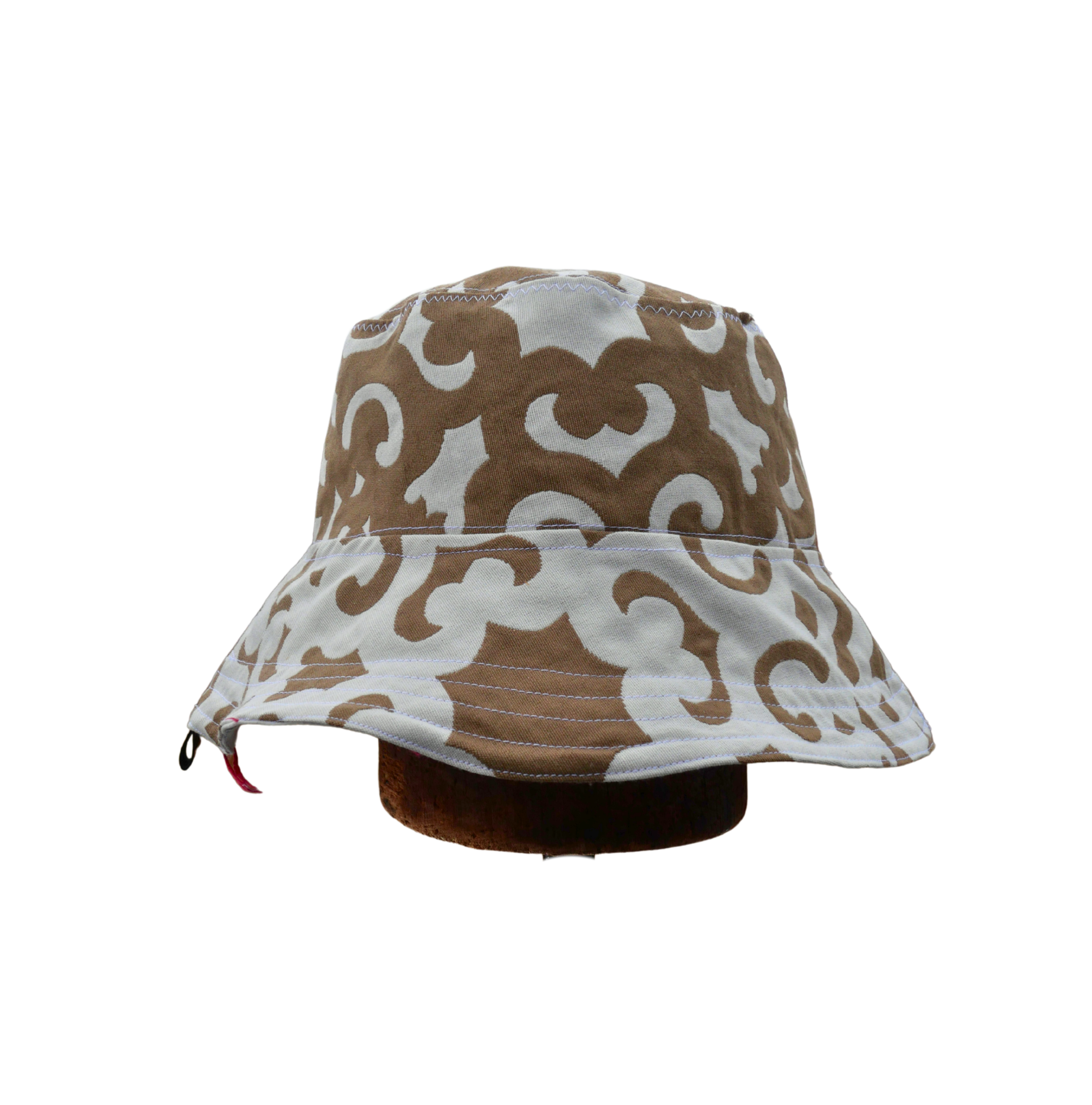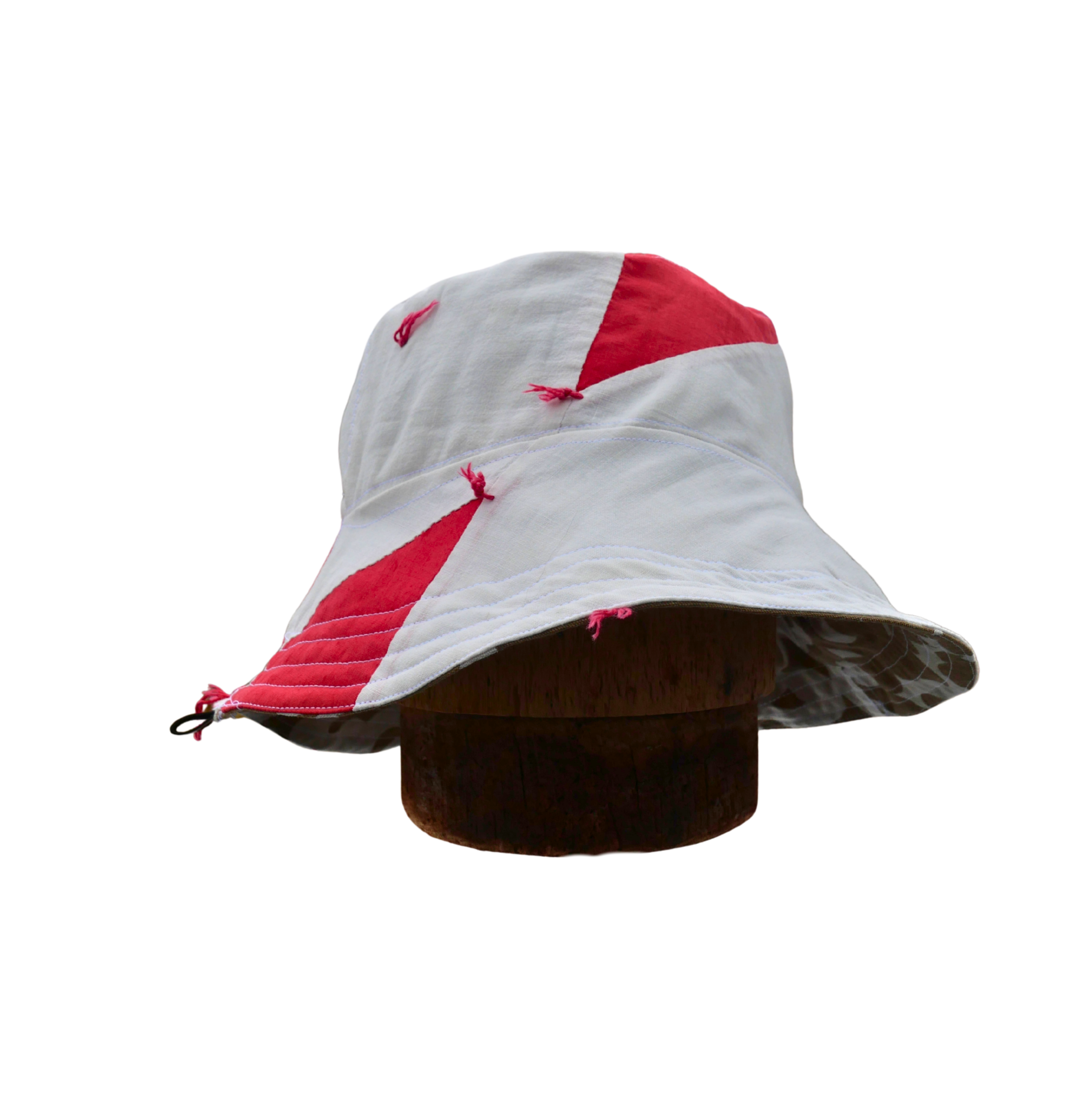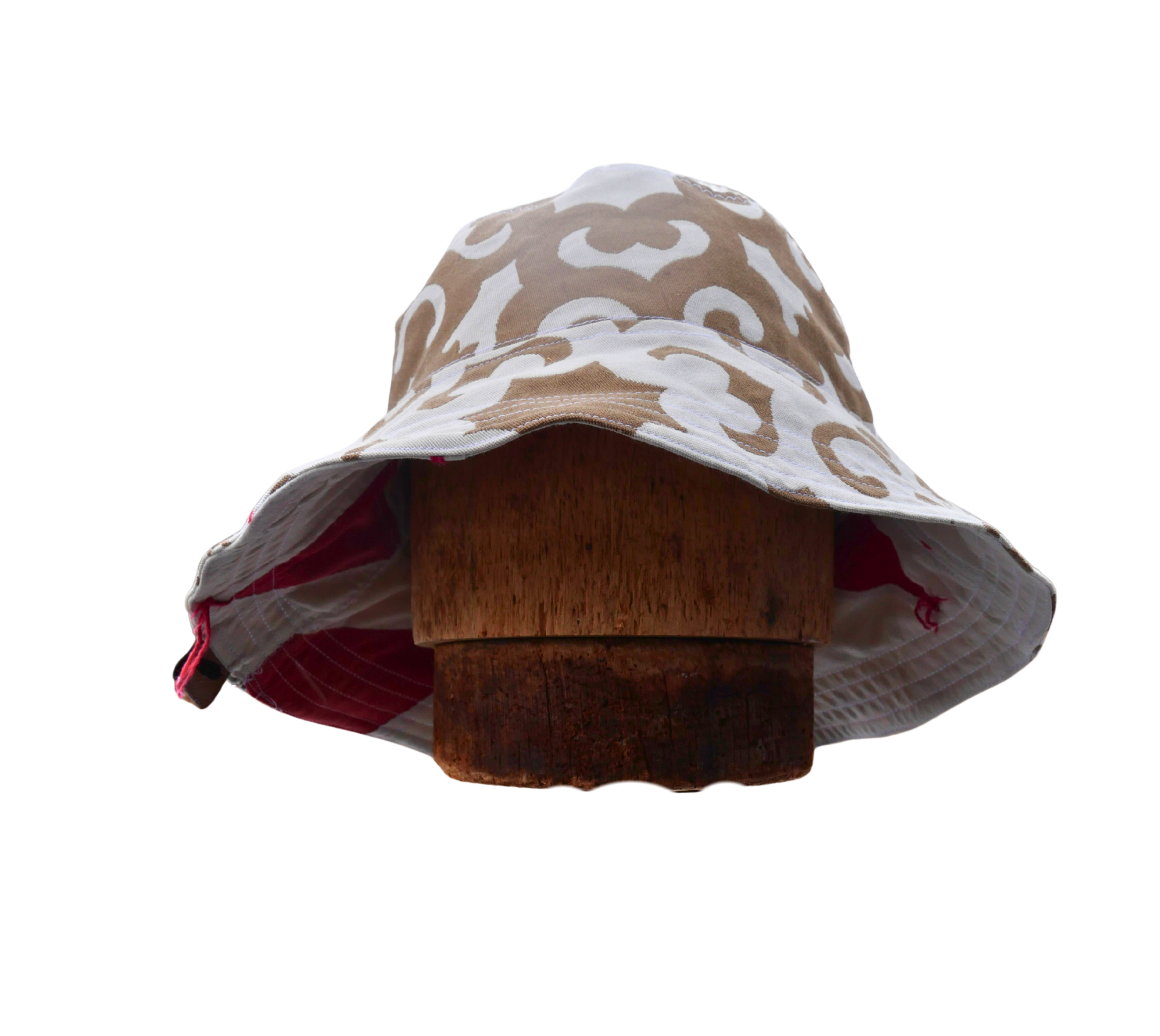 North Ferry Hats is offering a small batch of hand-crafted Bucket Hats for Spring 2026. All of our Bucket Hats are made using Upcycled fabrics. Featured hat is a 2 Print Reversible Cotton Canvas Bucket Hat with Tan Paisley on one side, and a White with Red Triangles Cotton print on the other side