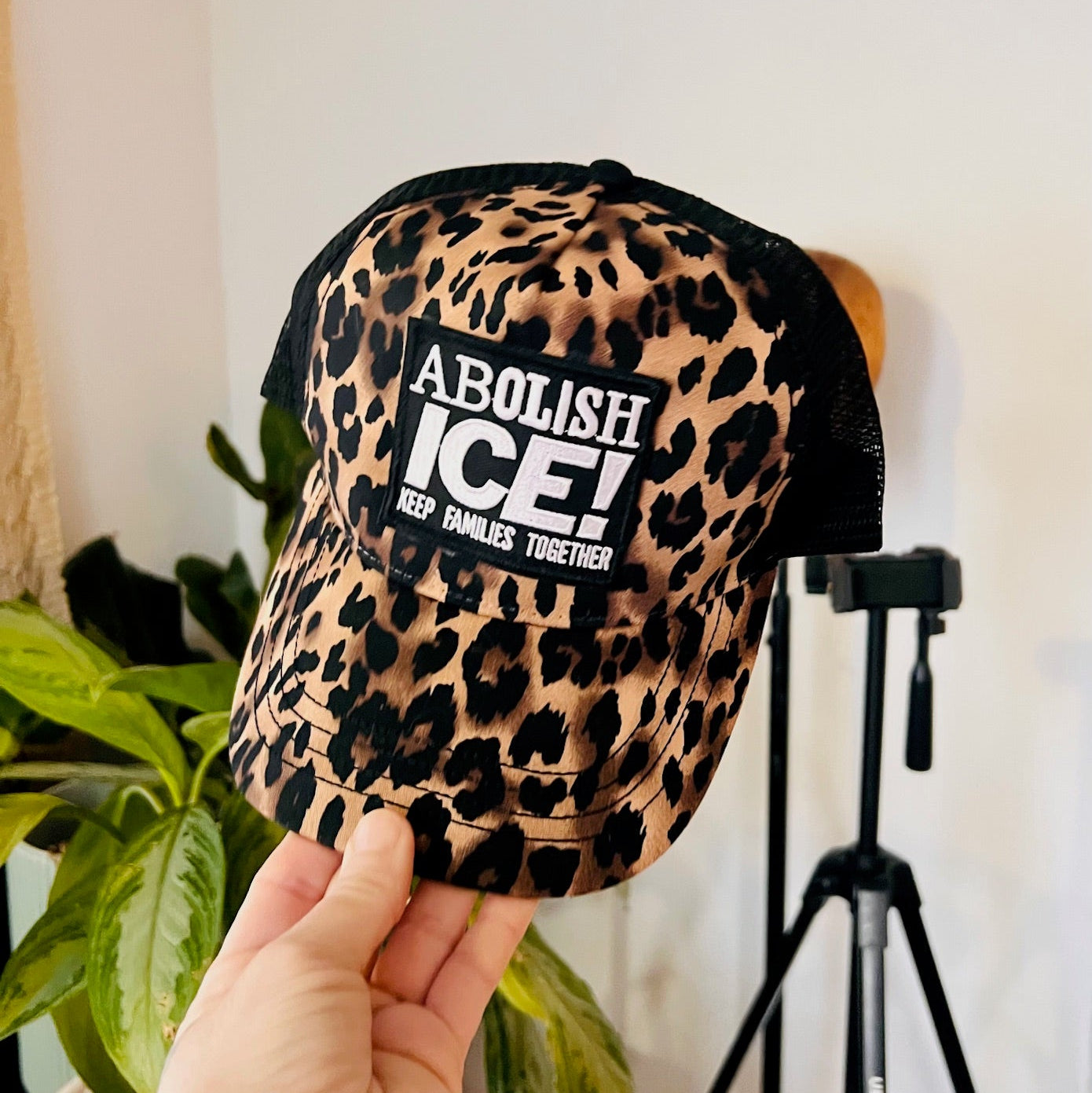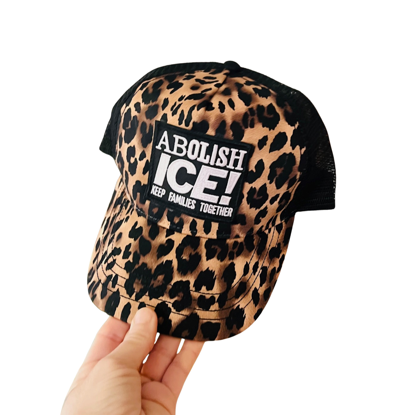 Abolish Ice! Keep Families Together Sassy Cougar Caps with leopard print and black mesh, and adjustable Sizing.