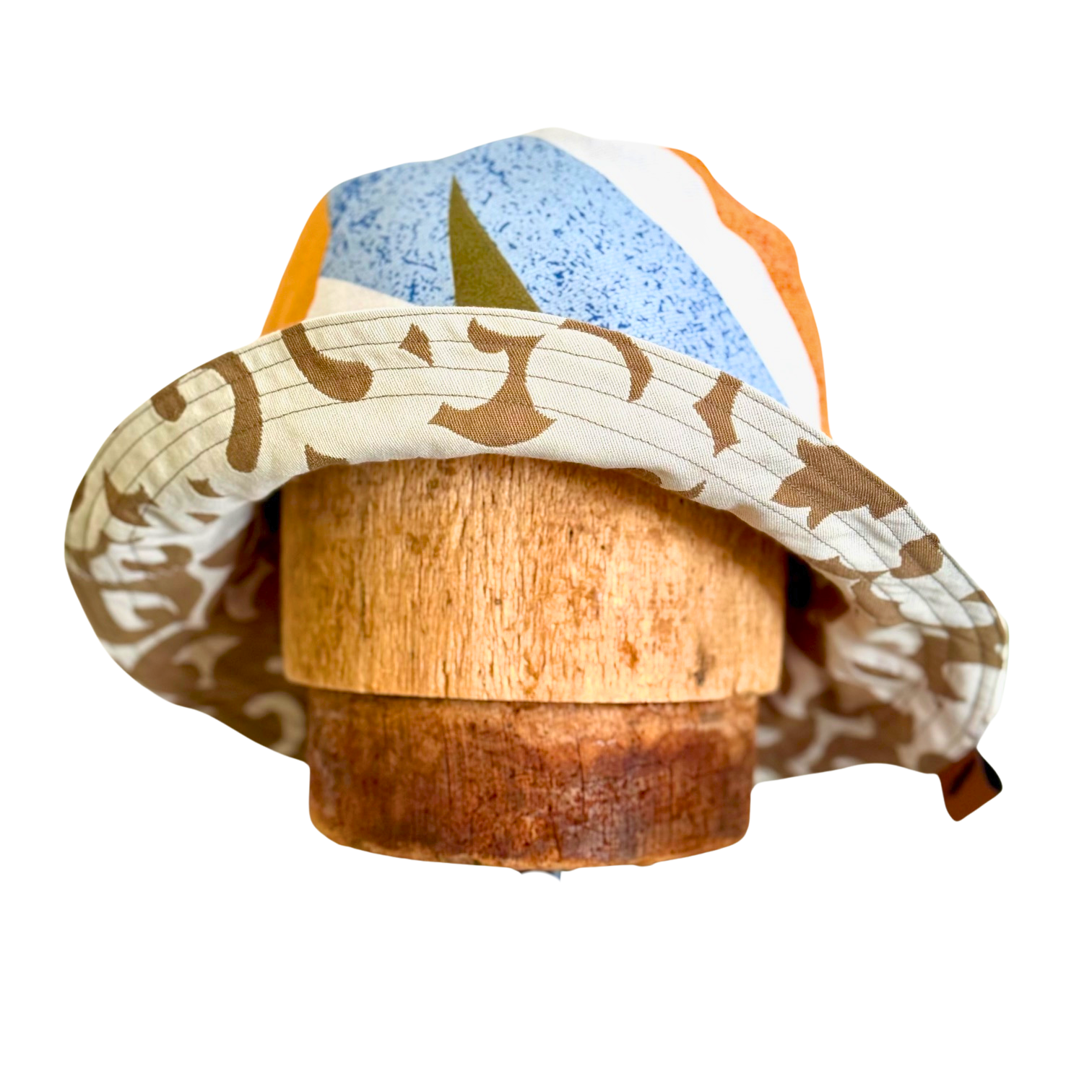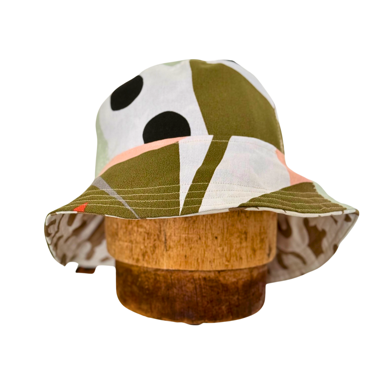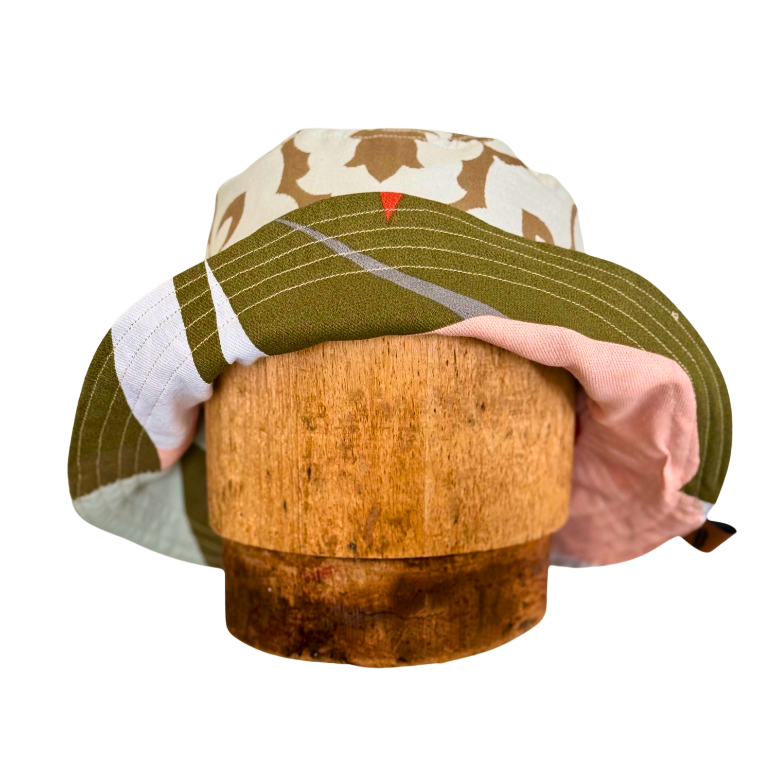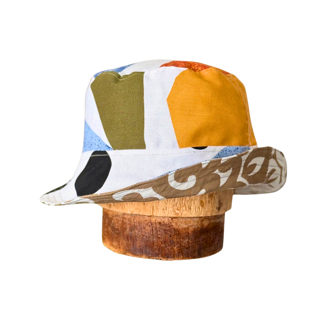 North Ferry Hats is offering a small batch of hand-crafted Bucket Hats for Spring 2026. All of our Bucket Hats are made using Upcycled fabrics. Featured hat is a 2 Print Reversible Cotton Canvas Bucket Hat with Tan Paisley on one side, and a White with Earthy Pastel Shapes Cotton print on the other side